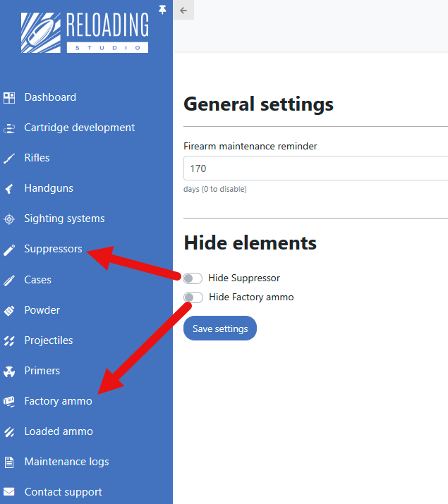 For example, enabling ‘Hide Suppressor’ will hide this option from the main (left-side) application menu and firearm management forms: